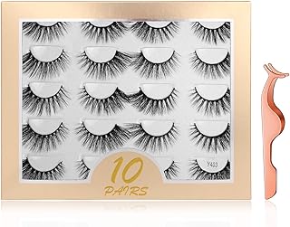 Faux cils 10 paires- Cils pour le visage réutilisables professionnels pour tous les yeux, Cils en faux vison 3D faits à la main, épais et naturels avec pince à cils de précision (Y403)